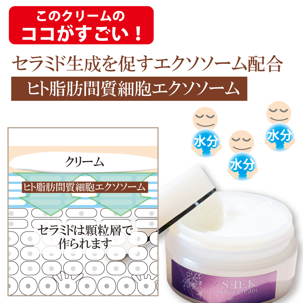 ソフタークリームに使用しているヒト脂肪間質細胞エクソソームは 通常よりさらに低分子化され細胞を行き来しやすく、セラミドの生成を促すエクソソームです。