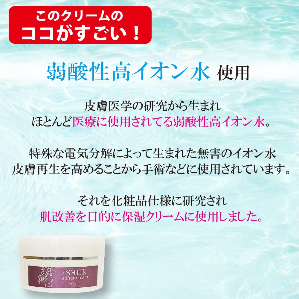 2つ目の特徴は、精製水の代わりに肌再生を促す高価な水:弱酸性高イオン水を使用していることです。