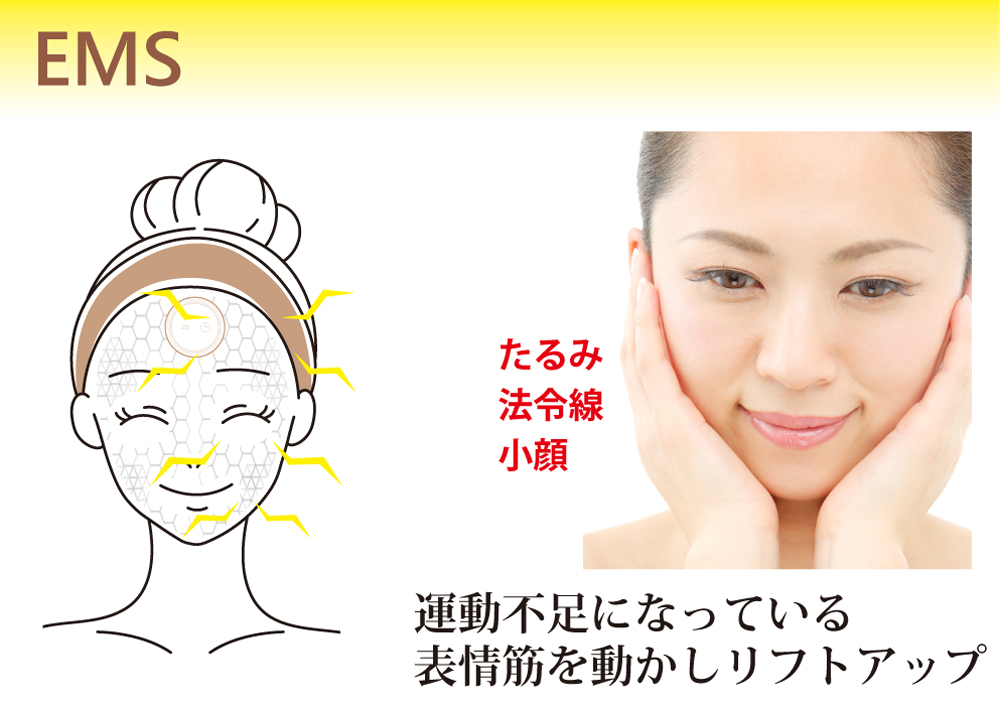 EMS(表情筋刺激運動)として運動不足になった表情筋に働きます。