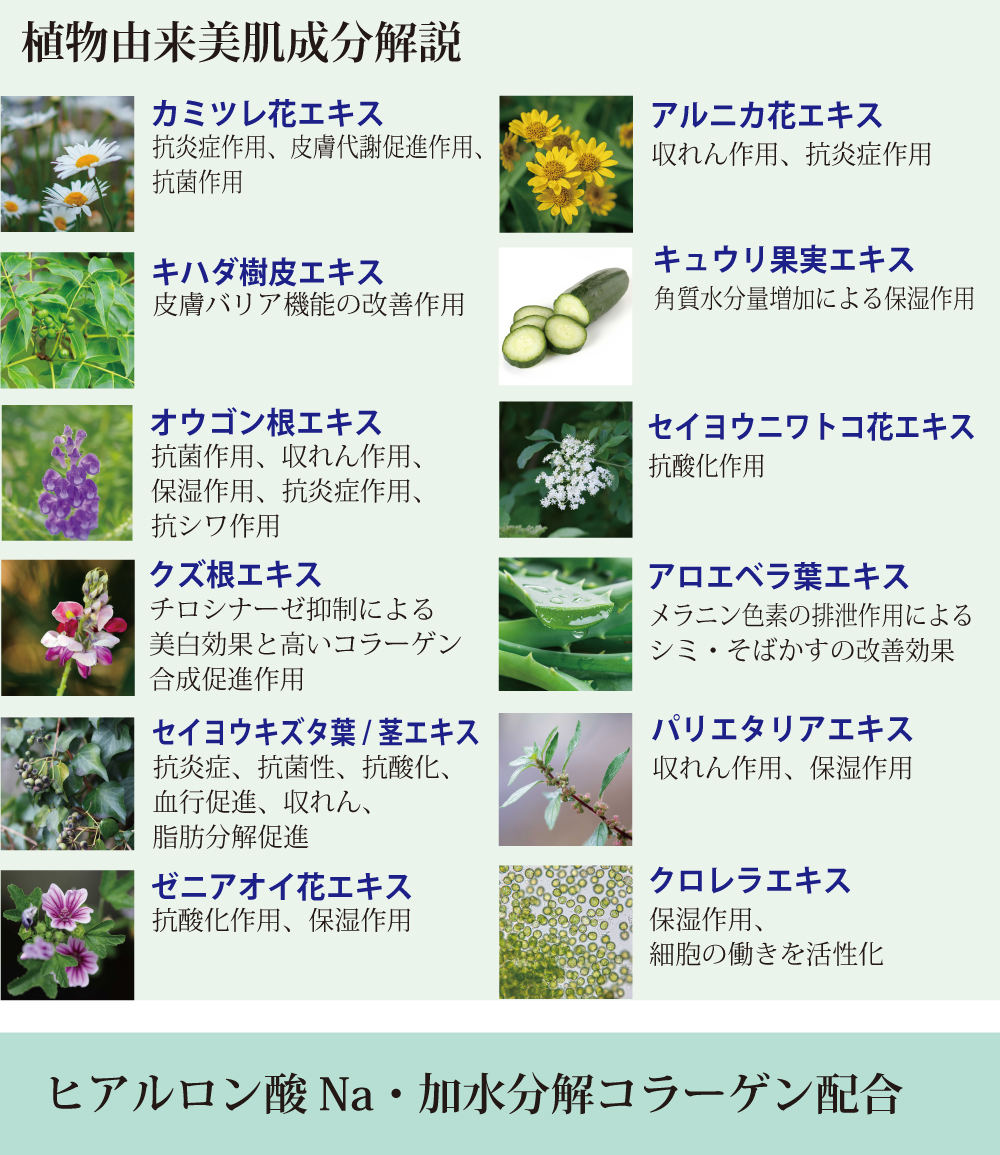 | 全成分:水、BG,グリセリン、ペンチレングリコール、ブドウ酒、ヒト脂肪間質細胞エクソソーム、ヒトサイタイ血幹細胞順化培養液、ヒト線維芽細胞順化培養液、ヒアルロンサンNa、加水分解コラーゲン、マンダリンオレンジエキス、カミツレ花エキス、キハダ樹皮エキス、オウゴン根エキス、クズ根エキス、セイヨウニワトコ花エキス、アロエベラ葉エキス、アルニカ花エキス、キュウリ果実エキス、セイヨウキズタ葉/茎エキス、ゼニアオイ花エキス、バリエタリアエキス、クロレラエキス、乳酸桿菌/ナツメヤシ果実発酵エキス、グリチルリチン酸2K、グルコース、塩化Ca、塩化K、塩化Na、アルギニン、フィチン酸、酸化銀、カルボマー、カプリリルグリコール、水酸化Na、フェノキシエタノール |