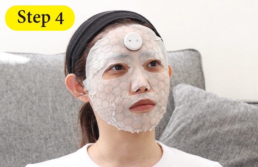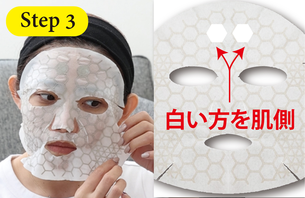 ①不織布マスクに美容液を馴染ませ、そのマスクを顔につけます。