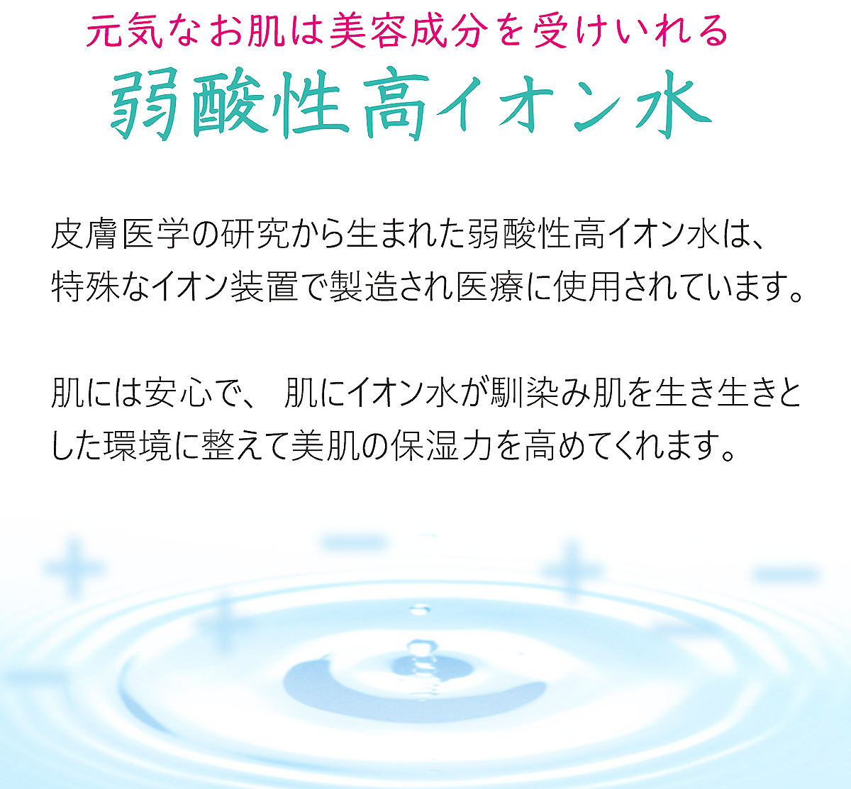 様々な高価な化粧品を使っているが、「効果がいまいち」ということがありませんか?それは肌の環境が乱れているのかもしれません。肌の環境が乱れていると 美肌成分を受けとめる力が衰えます。そこで肌の環境を整えることができる皮膚医療の分野で開発された弱酸性高イオン水です。