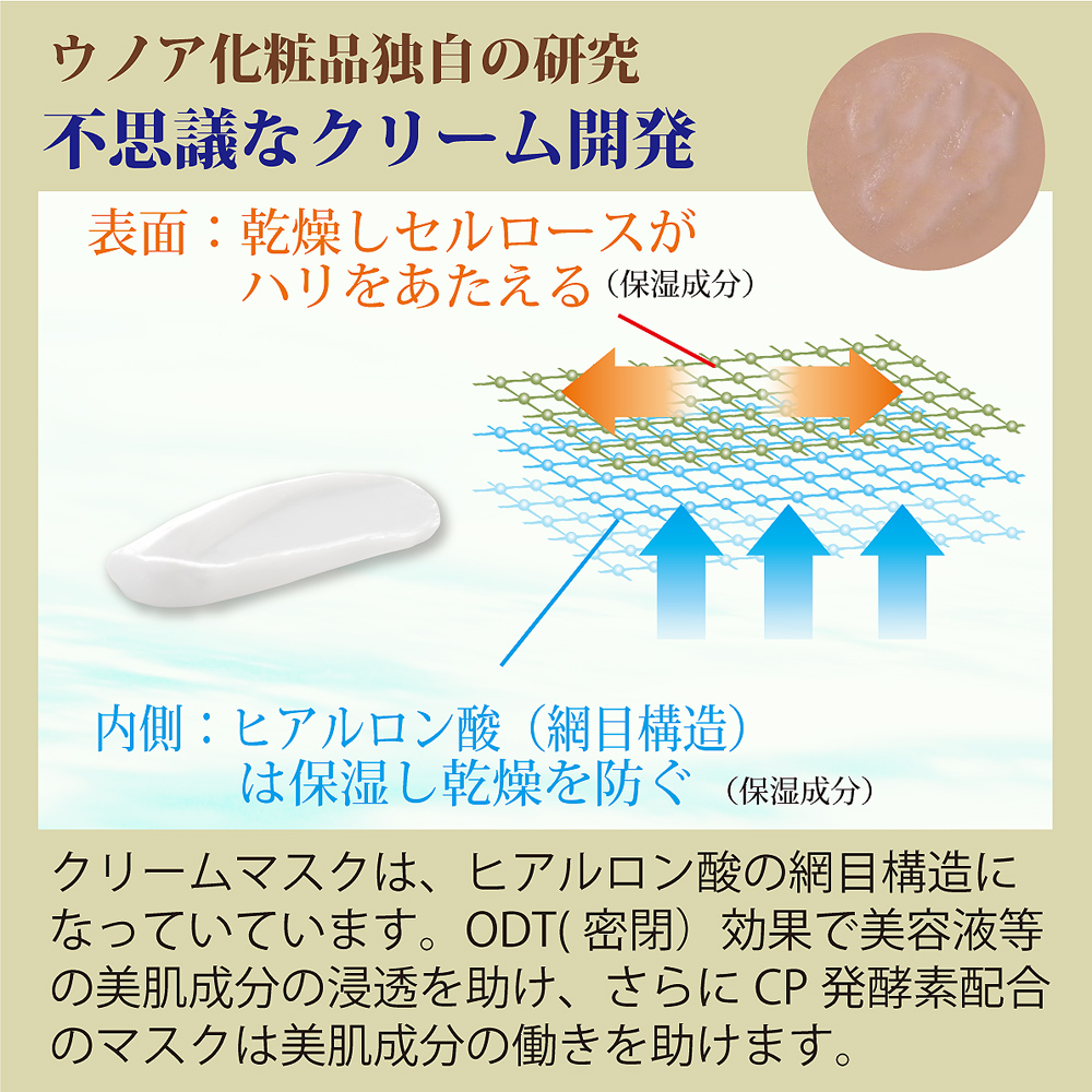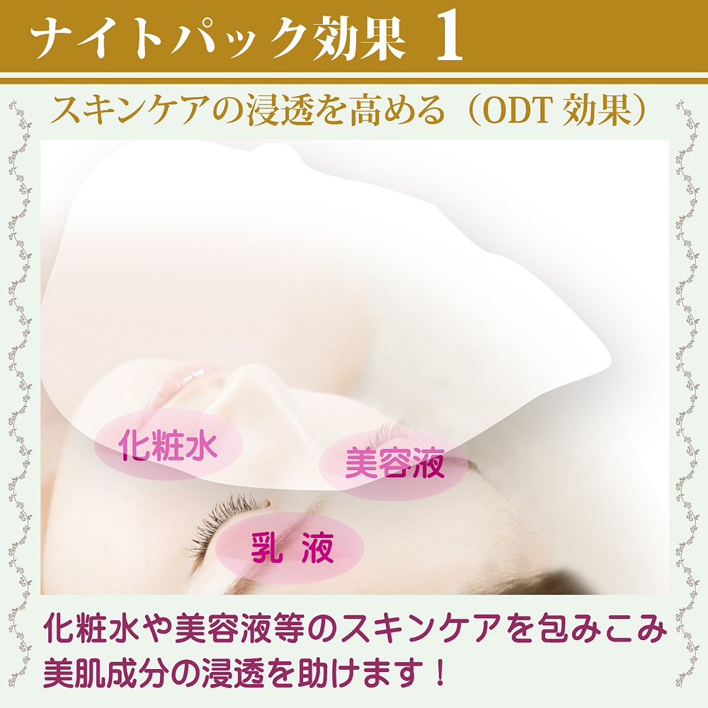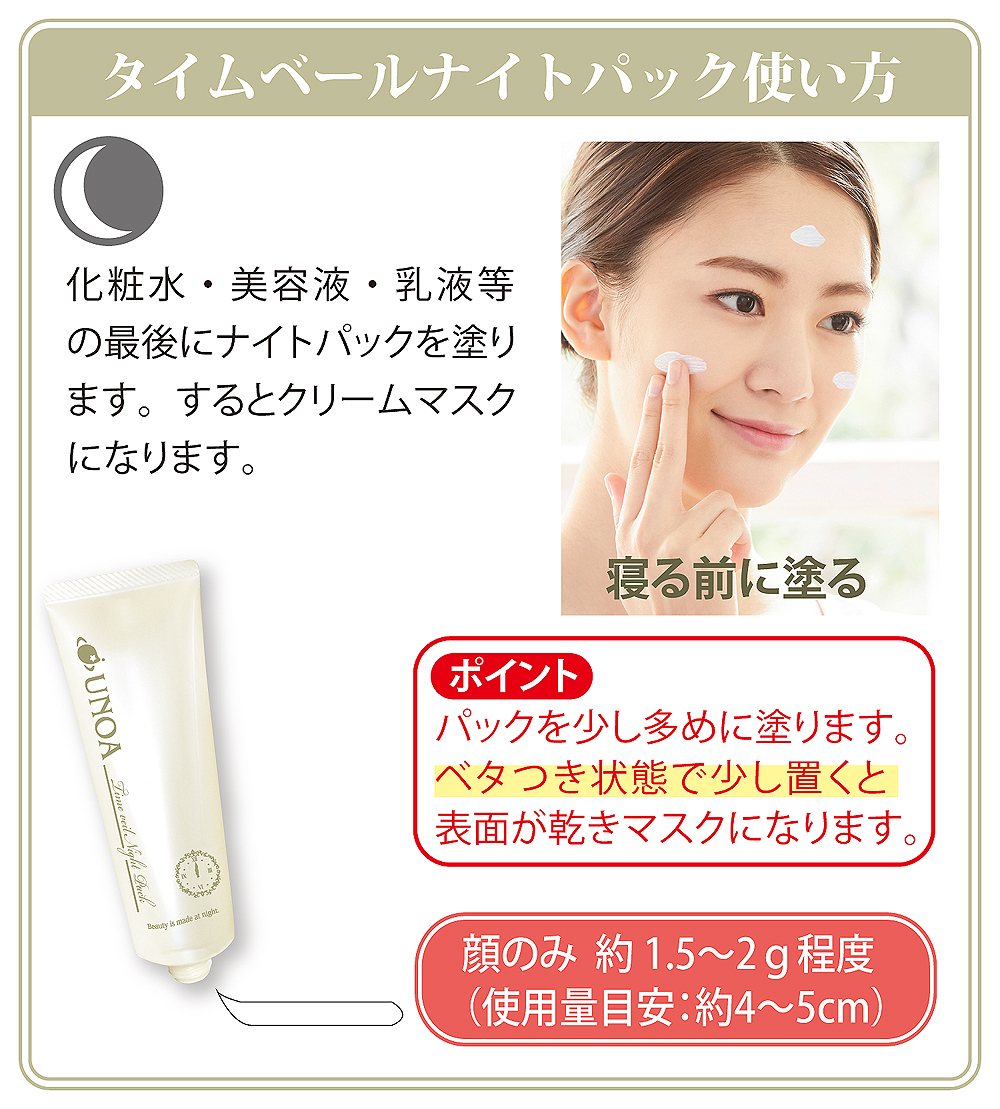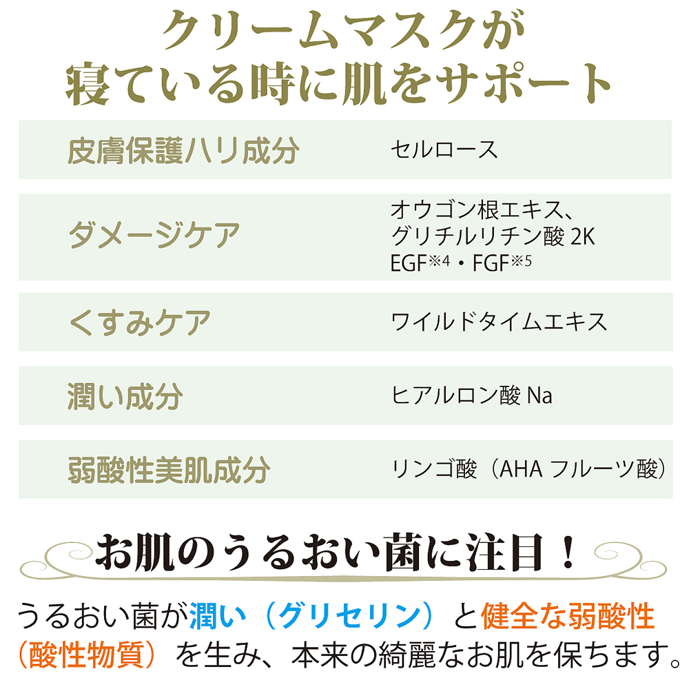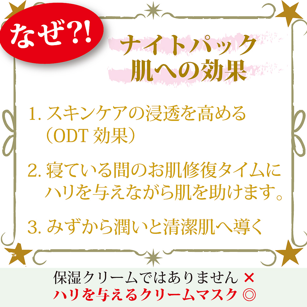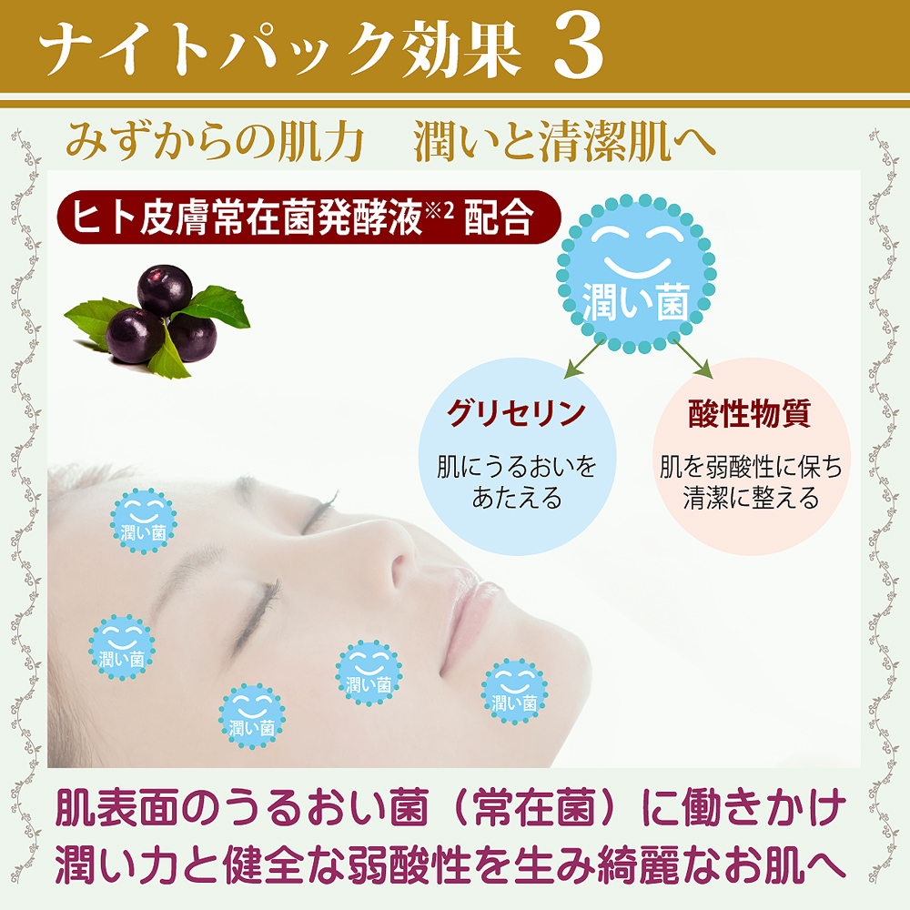| 昼間使った肌は寝ている時に修復・新生を行ないます。これがしっかり行なわれているといつまでも綺麗なお肌でいられます。加齢やトラブルで弱ると老化が始まります。 それをしっかりとサポートするのがナイトパック。 寝る前に塗ったクリームがお肌にハリを与えながら整え、朝のお肌を気持ちよくさせます。 CP発酵素※2配合で自らの潤い力を整えます。! ※朝の洗顔で洗い流す | 特徴成分 |