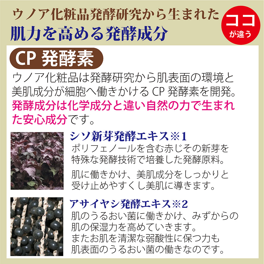 CP発酵素:シソ新芽発酵エキス (ウノアオリジナル原料)※1 ヒト皮膚常在菌発酵液※2 |