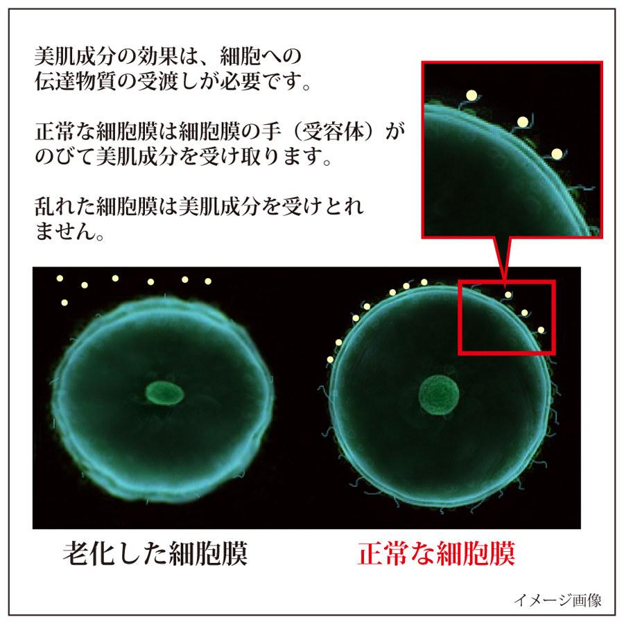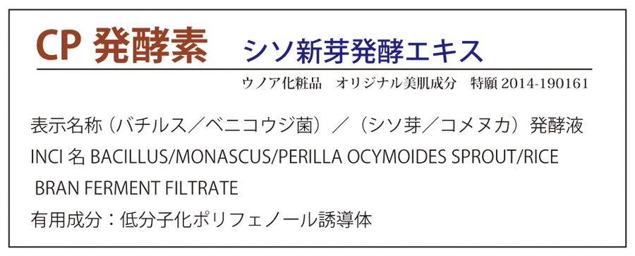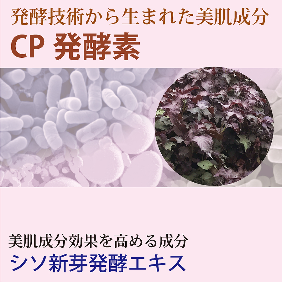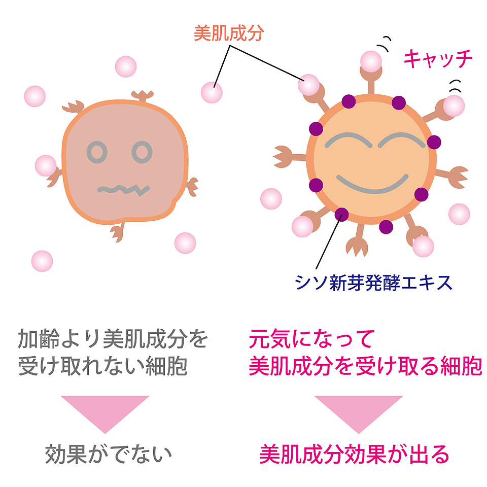 CP発酵素のシソ新芽発酵エキスは、細胞膜に働きかけ、細胞膜の手(受容体)を元気にして美肌成分をしっかりと受取ってお肌への効果を高めていきます。