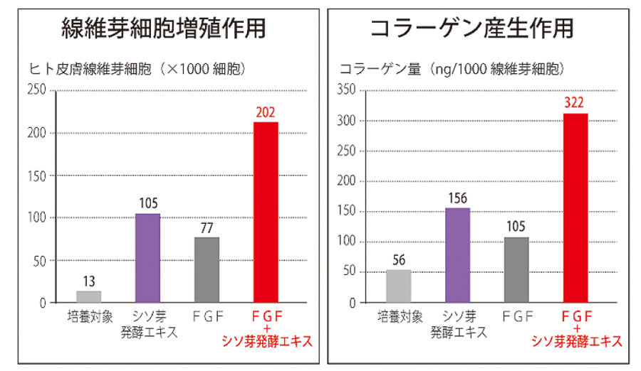 またFGF(線維芽細胞増殖因子)の効果を高め、線維芽細胞も増殖させることでコラーゲンやエラスチンの産生作用も高めます。