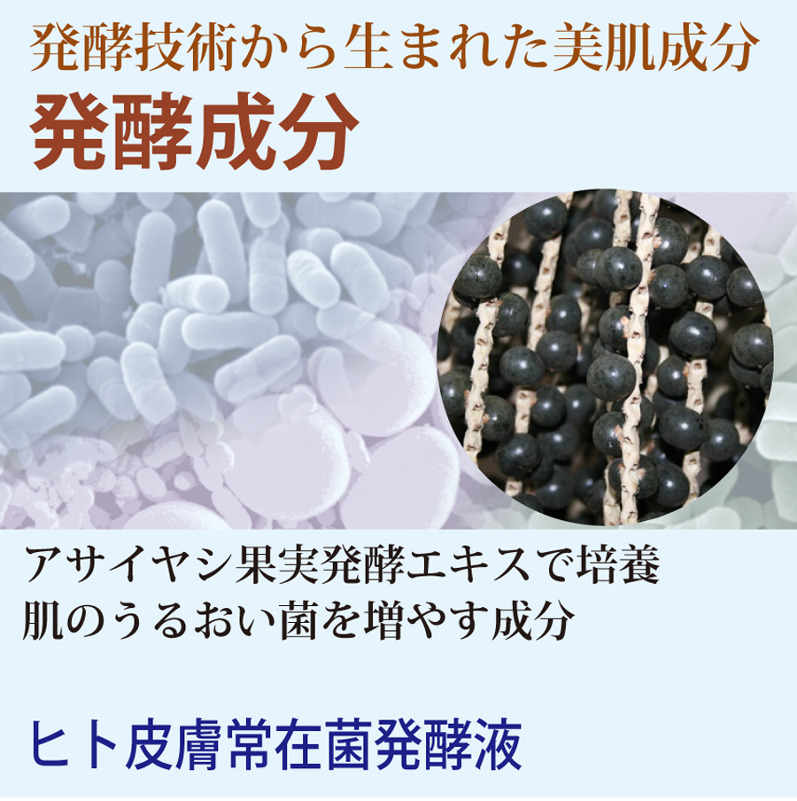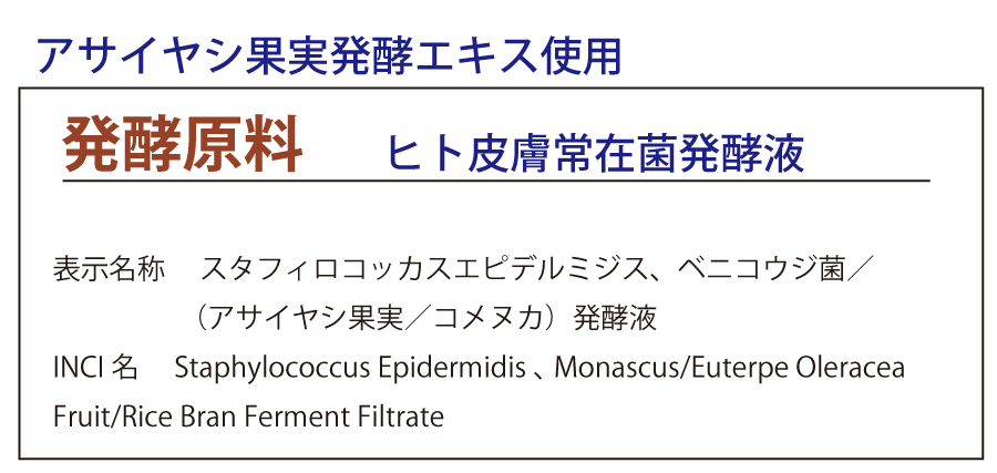 ヒト皮膚常在菌発酵液は、お肌にうるおい菌を増やす働きをします。CP発酵素のアサイヤシ果実発酵エキスは、ヒト皮膚常在菌発酵液のうるおい菌を培養させる重要な役割をはたしています。