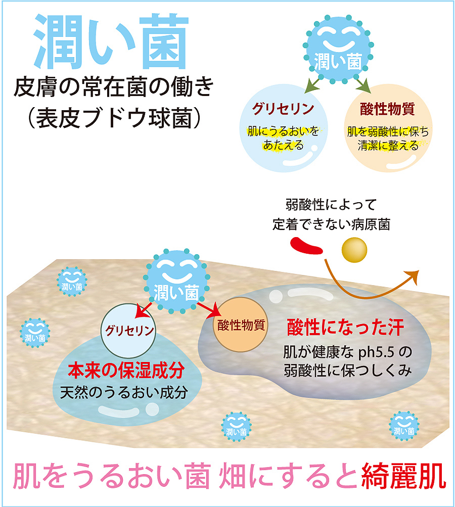 お肌の表面には1000種類以上の菌が存在します。炎症(赤みや腫れ)をもたらすアクネ菌や黄色ブドウ球菌などの悪玉菌も存在します。うるおい菌(善玉菌)が多い肌では弱酸性で本来のきれいな潤い肌になります。