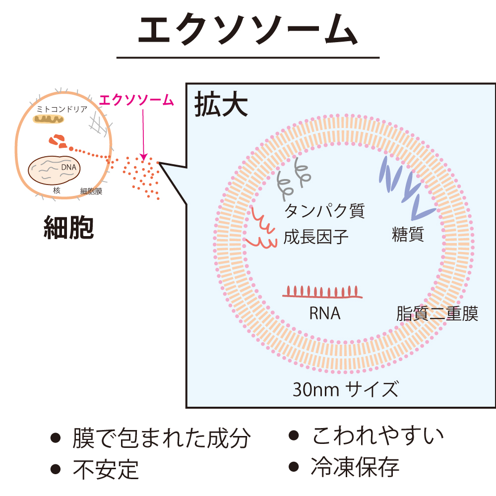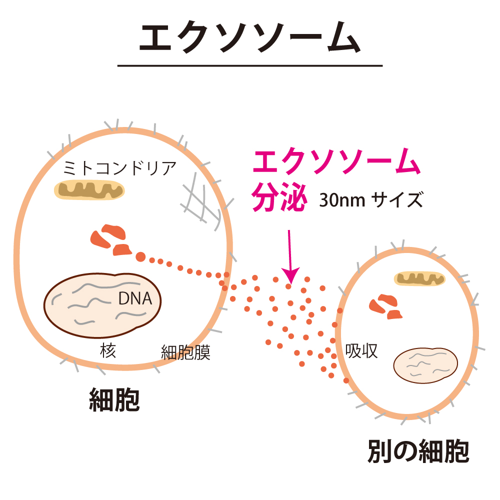 幹細胞自身がだす成分分泌を運ぶ直径30~150nmほどの細胞外小胞物質で、細胞間の情報伝達を担う物質です。