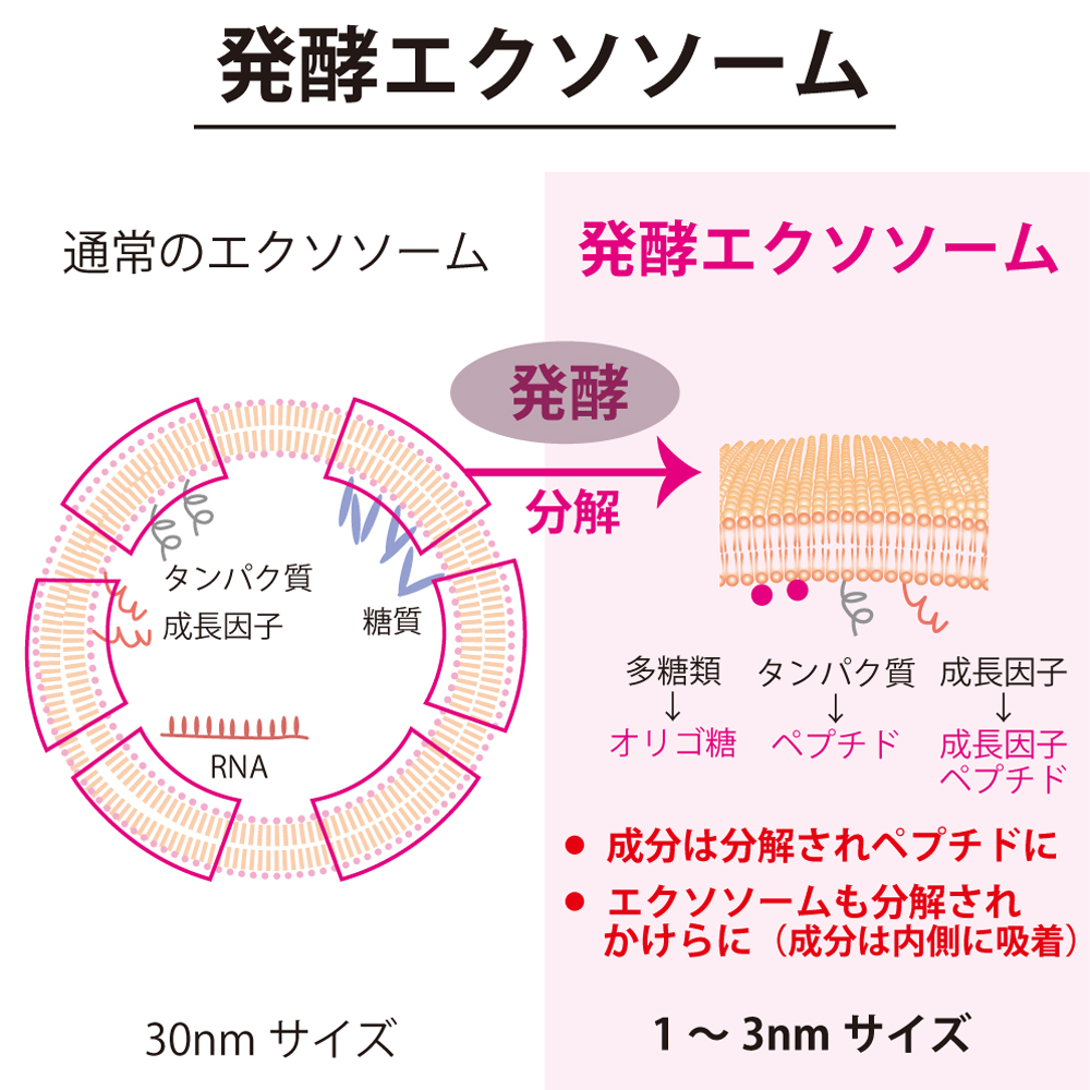 特殊技術で発酵されたエクソソームはエクソソーム自身も分解され、さらに小さなかけらになります。 そのかけらの内側には、さらに小さくなった成長因子ペプチドなどの成分が吸着し、肌の隅々まで伝えてくれます。