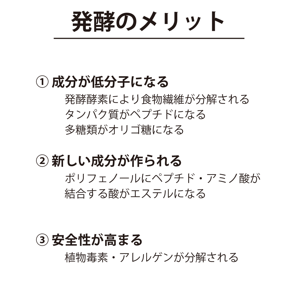 発酵とは、細菌、酵母、カビ等の微生物の働きによって物質が変化する現象です。食物繊維が分解されたり、成分が分解されて タンパク質がペプチドになったり多糖類がオリゴ糖になったりします。